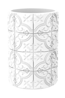 ДxШxВ: 91x91x113 мм Материал корпуса: полирезин Поверхность: матовая Цвет корпуса: белый Полирезиновый стакан в бело-черной гамме, устойчивая форма, стильный и прочный — идеален для организованного хранения щеток в ванной.