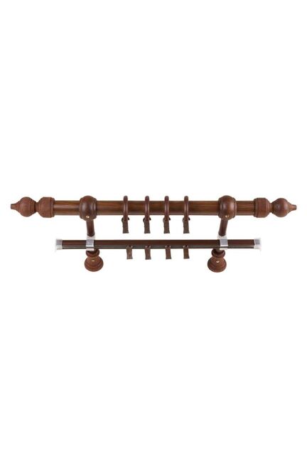 Особенностью карниза «Ретро» является фигурный кронштейн, который обеспечивает более удобное и надежное крепление трубы и шины, а также упрощает эксплуатацию - снять шторы с карниза «Ретро» очень легко. Комплектующие: стальная ламинированная труба d-28 мм, стальная шина, пластиковая фурнитура (кронштейны, кольца, крючки, наконечники), дюбели, саморезы. Карниз имеет индивидуальную упаковку. Двухрядный металлический карниз 2 м цвета орех для легких и средних штор — стильное и надежное решение для вашего интерьера.