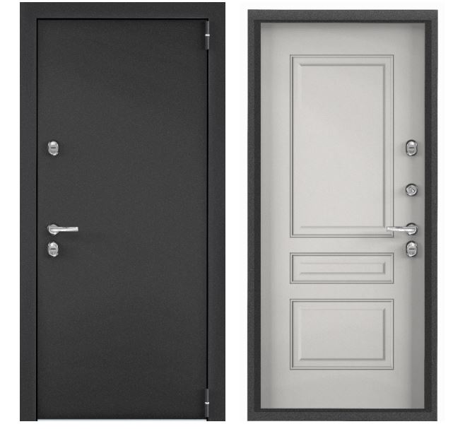 Тип внешней отделки: порошково-полимерное покрытие. Тип внутренней отделки: панель МДФ с ПВХ покрытием. Верхний замок: BORDER 3В 8-8Г/15, 4-го класса взломостойкости по ГОСТ 5089-2011. Нижний замок: Crit A30-4Л, 2-го класса вломостойкости по ГОСТ 5089-2011. Декоративные накладки на ключевину сувальдного замка с направляющими для ключа и подпружиненными шторками от продувания. Противосъемные ригели с петлевой стороны полотна 2 шт. Ночная задвижка.