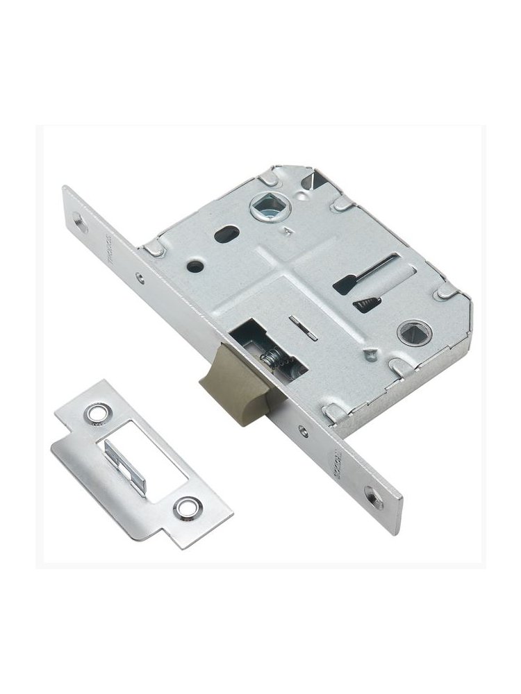 Врезная защелка с фиксацией, пластиковый корпус, хром, легкая установка, подходит для санузлов и межкомнатных дверей, надежна и долговечна.