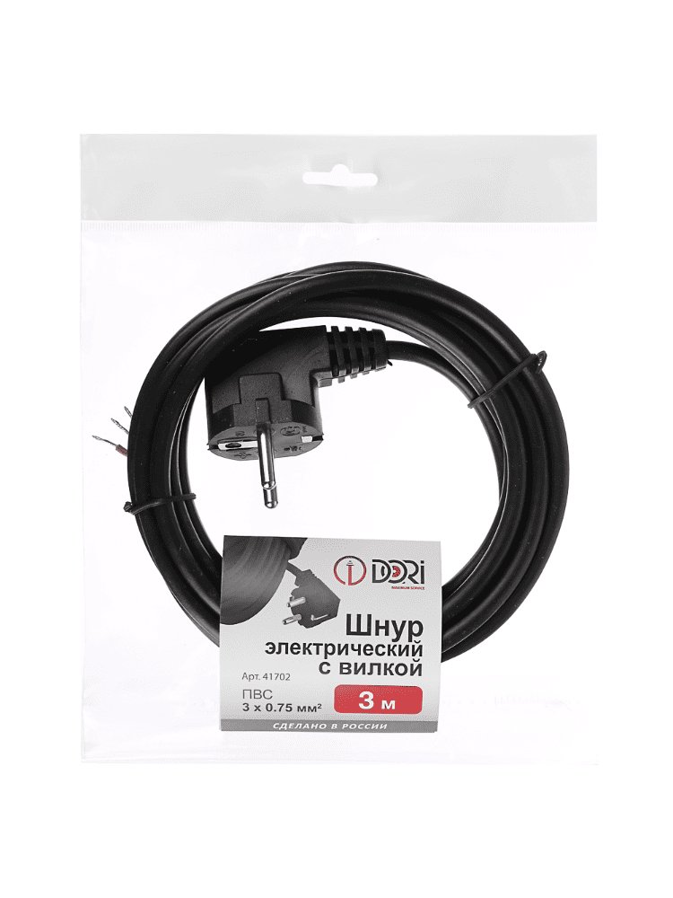 Трёхжильный гибкий шнур с вилкой, длина 3 м, сечение 0,75 мм², подходит для устройств с заземлением, надёжная изоляция, универсален в применении.