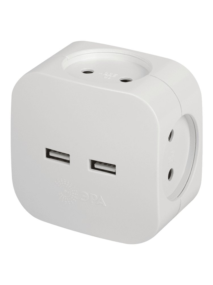 Разветвитель электрический 4 гнезда (четверник) без з/к 10А 2 USB белый ЭРА