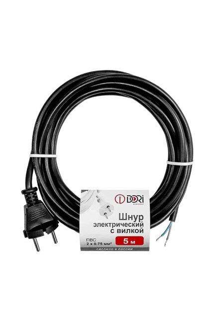 Гибкий шнур 5 м с вилкой, 2x0,75 мм², устойчивая изоляция, для безопасного подключения инструментов и техники в доме и на стройке.