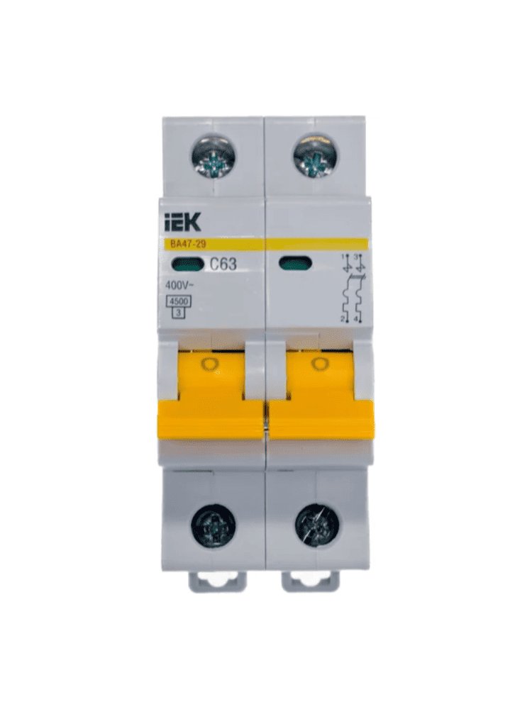 Двухполюсный автоматический выключатель 2P 63A (C), номинальный ток 63 А, отключающая способность 4,5 кA, серия BA47-29 IEK, предназначен для защиты электросети от перегрузок и коротких замыканий. Эргономичная конструкция корпуса и компактные габариты облегчают монтаж в стандартные распределительные щиты, винтовые клеммы обеспечивают надёжный контакт с проводниками, индикатор состояния позволит быстро определить положение автомата.