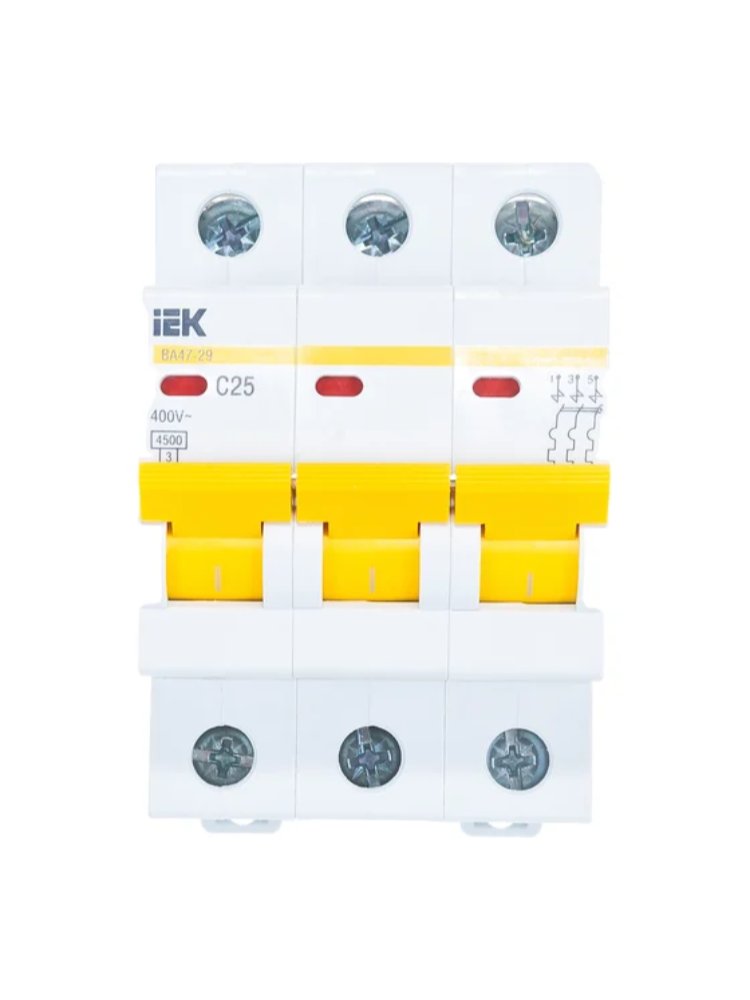 Трёхполюсный автоматический выключатель рассчитан на номинальный ток 25 А и обеспечивает защиту электросети от кратковременных перегрузок и коротких замыканий. Рабочее напряжение до 400 В, тип рабочей характеристики – C, что позволяет использовать его для защиты цепей с умеренными пусковыми токами. Максимальная отключающая способность – 4,5 кА гарантирует срабатывание устройства даже при резких скачках тока. Устройство компактно, устанавливается на стандартную DIN-рейку, устойчиво к перепадам температуры и идеально подходит для монтажа в распределительных щитах жилых и коммерческих объектов.