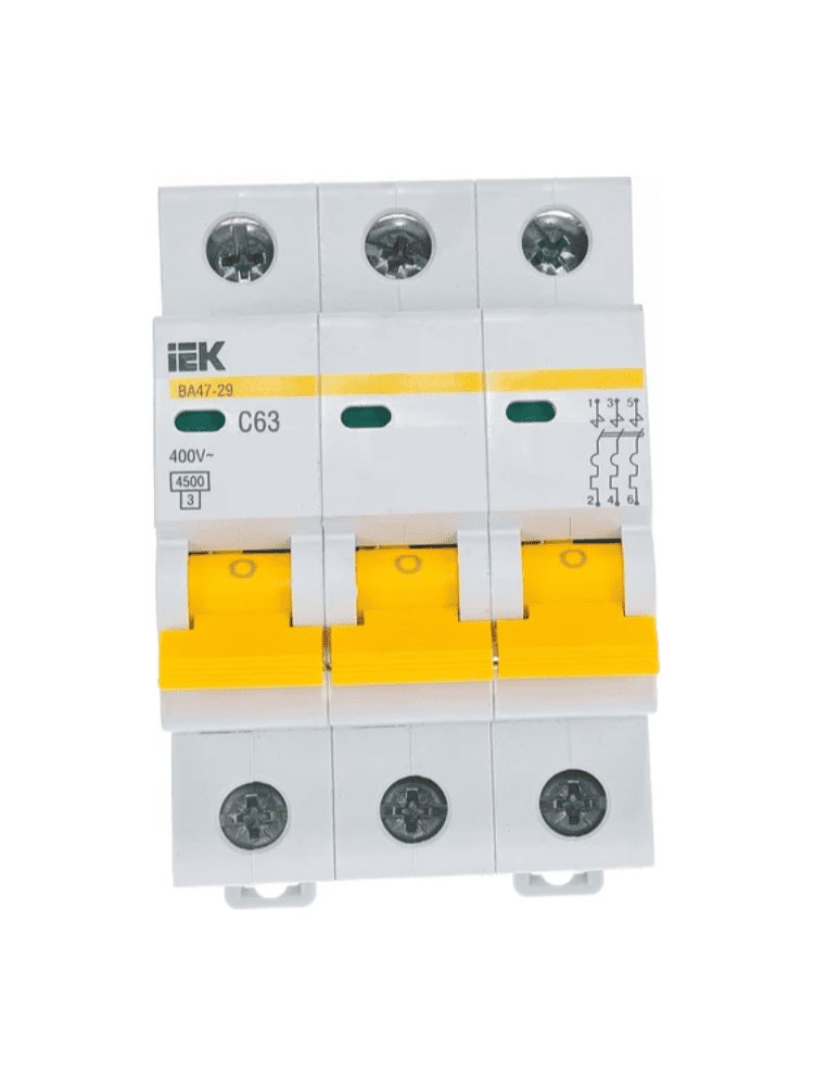 Трёхполюсный автоматический выключатель номиналом 63А с характеристикой срабатывания C и отключающей способностью 4,5кА идеально подходит для защиты электросетей от перегрузок и коротких замыканий. Устройство оснащено надежной долговечной контактной системой и легко устанавливается на DIN-рейку. Корпус выполнен из прочного негорючего материала, обеспечивая безопасность эксплуатации даже в сложных условиях.