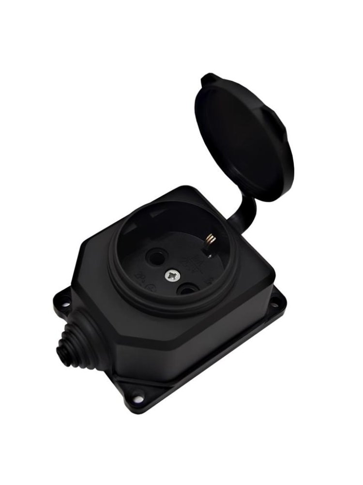 Одногнездная розетка 16А с защитной крышкой и заземлением, IP44, для безопасной работы в условиях влаги и пыли, корпус из каучука.