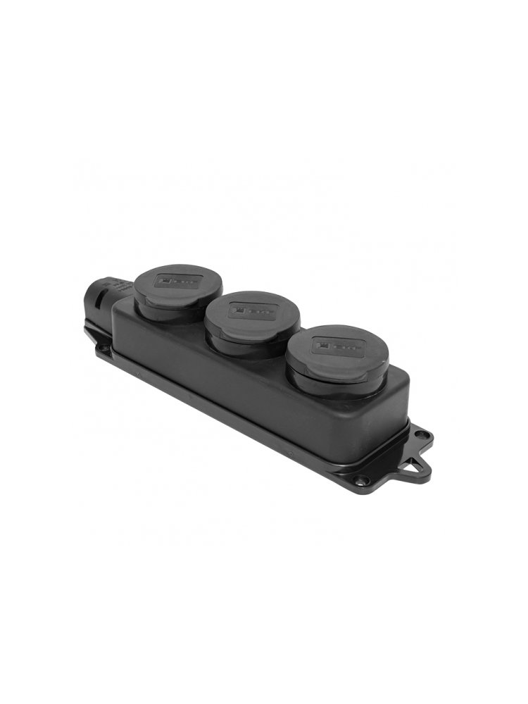 Три розетки с заземлением, корпус из каучука, IP54, для подключения в помещении и на улице, выдерживает ток до 16А.