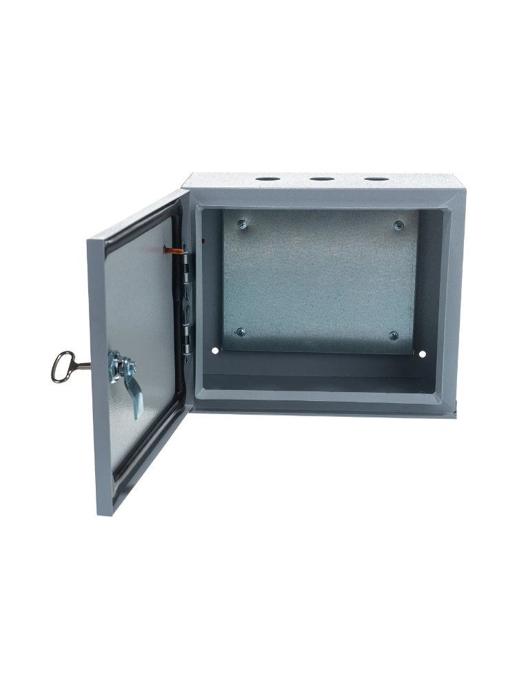 Корпус оснащён съёмной монтажной панелью, выполнен из стали толщиной 1,0 мм, окрашен термоустойчивой порошковой эмалью, степень защиты IP54 обеспечивает надежную защиту от пыли и влаги, двери фиксируются на металлической петле и оснащены замком. Удобный вывод кабеля предусмотрен с сальниковыми отверстиями на верхней и нижней стенках. Компактные габариты 250×300×155 мм позволяют размещать устройство в условиях ограниченного пространства.