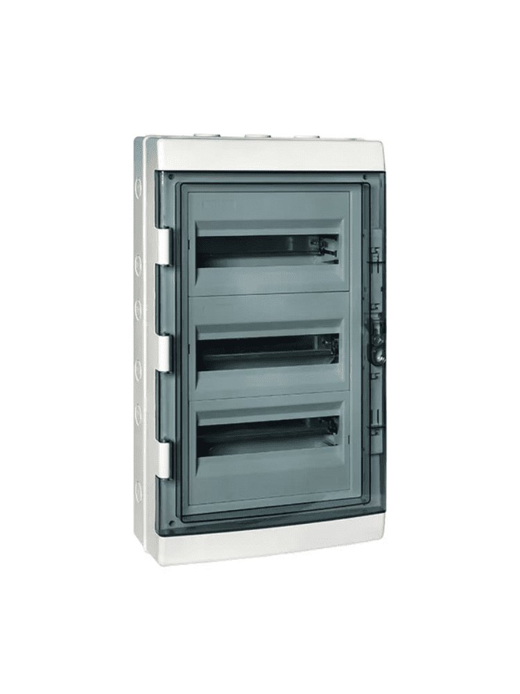 Пыле- влагозащищённый щит на 36 модулей с прозрачной дверью, для безопасного монтажа электрического оборудования в помещениях и на улице.