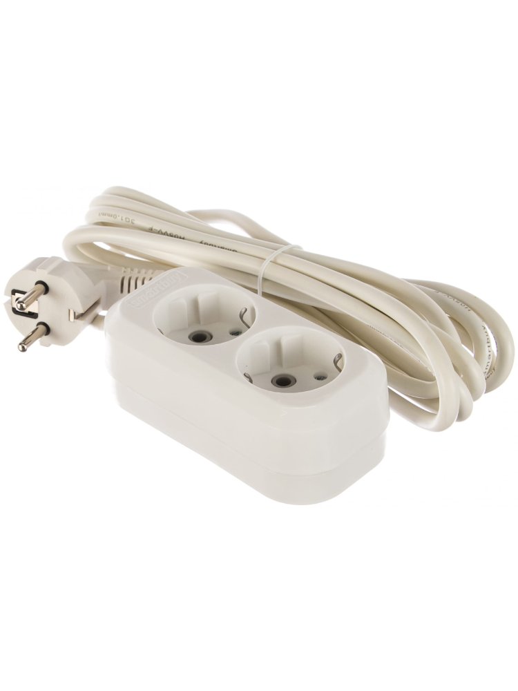 Номинальное напряжение: 250 В; Частота: 50 Гц; Номинальный ток: 16 А; Тип провода: ПВС 3x1,0мм2; Материал корпуса: АБС-пластик; Климатическое исполнение: УХЛ-3; Степень защиты от влаги и пыли: IP-20; Цвет: белый. Удлинитель 2 гнезда, заземление, длина 3 м, ток до 16 А, медный кабель ПВС 3x1 мм² — для дома, офиса и стройки, надёжно и безопасно.