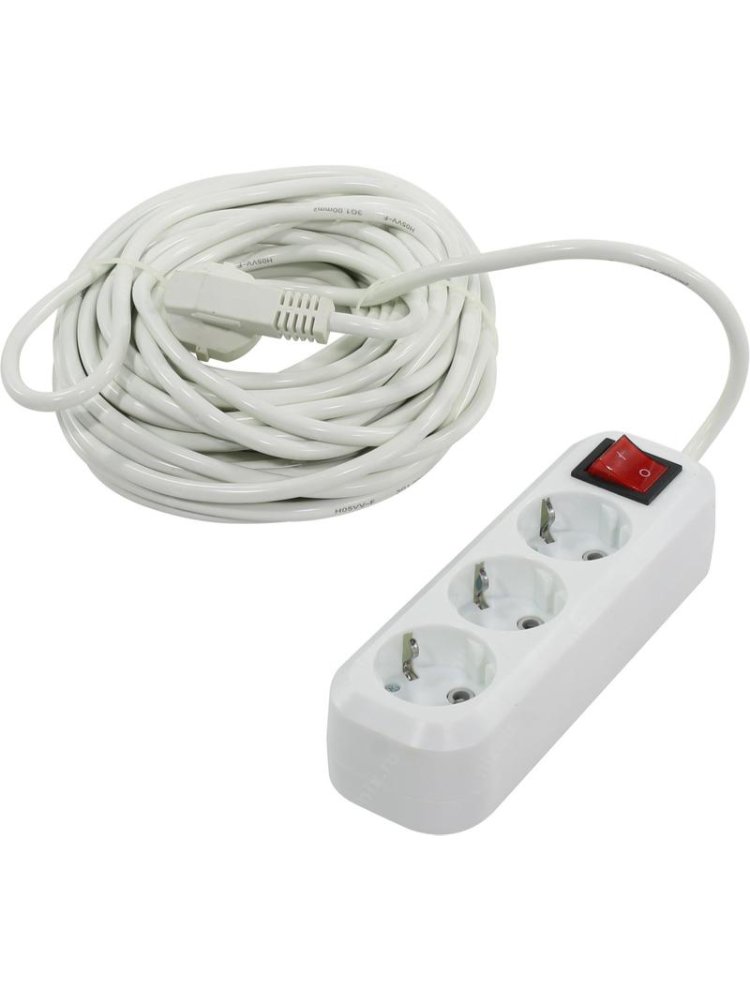 Надежный удлинитель с тремя розетками и выключателем идеально подходит для подключения электроинструментов и техники на стройке, в мастерской или дома, обеспечивая безопасность и удобство работы с приборами большой мощности.