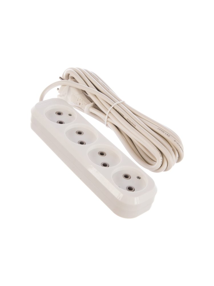 Номинальное напряжение: 250 В; Частота: 50 Гц; Номинальный ток: 10 А; Тип провода: ПВС 2x1,0мм2; Материал корпуса: АБС-пластик; Климатическое исполнение: УХЛ-3; Степень защиты от влаги и пыли: IP-20; Цвет: белый. 4 розетки, 5 м длина, нагрузка до 10А, без заземления — идеально для инструментов и бытовой техники в ремонте, на стройке и дома.