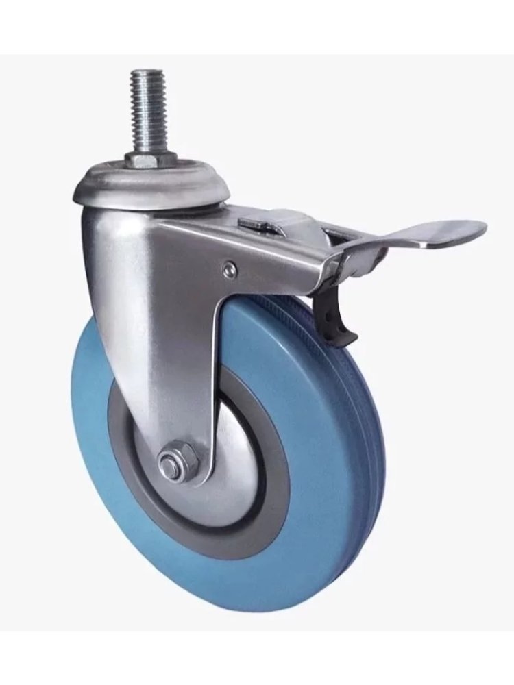 Колесная опора с серой резиной поворотная с болтовым креплением 50 мм адаптирована для работы в помещениях. Серая резина обладает очень мягким ходом и является достаточно маневренной. Данная опора оснащается двухрядным шарикоподшипником и имеет втулку скольжения оси. Шинка колесной опоры серая резина изготавливается из полипропилена серого цвета, чьей особенностью является шумопоглощение, малая вибрация и отсутствие следов на поверхности. Эта серия колес часто применяется при изготовлении медицинского передвижного оборудования, различных деталей мебели, складских тележек. Заводской температурный режим для данной серии варьируется между -20С° и +50С°. В качестве крепления использован болт, который выполнен из специальной стали с оцинковкой. Тормоз, предусмотренный конструкцией, в случае необходимости обеспечивает неподвижность конструкции. Колеса малой грузоподъемности, используются на медицинской мебели в основной и там где изделие катается по кафелю или плитке, чтобы не оставлять сле Поворотная колесная опор