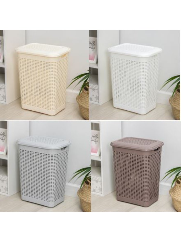 Вместительная пластиковая корзина 50 л с крышкой и вентиляцией, устойчива к влаге и ударам, удобна для хранения и переноса белья.