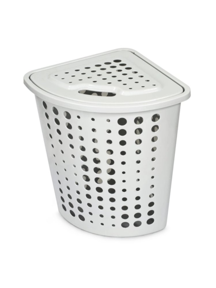 Угловая корзина 45 л легко впишется в интерьер, сэкономит место и сохранит вещи в порядке благодаря крышке и вентиляции.
