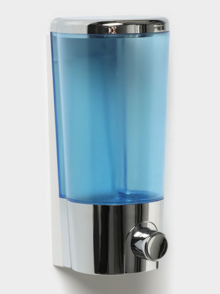 Настенный дозатор объёмом 500 мл в хромированном корпусе, компактный, прост в установке и обслуживании, подходит для дома и общественных помещений.