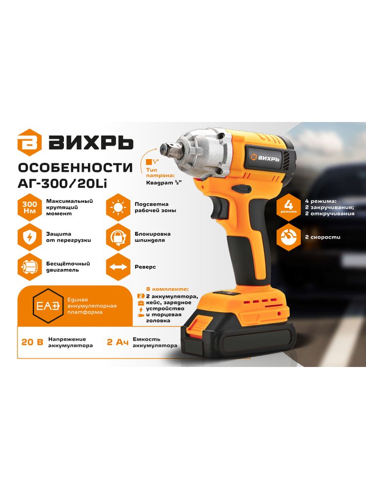 Гайковерт акк. ВИХРЬ АГ-300/20Li 20В, 300 Нм, 2*2Ач, бесщеточный, кейс в Вяземский