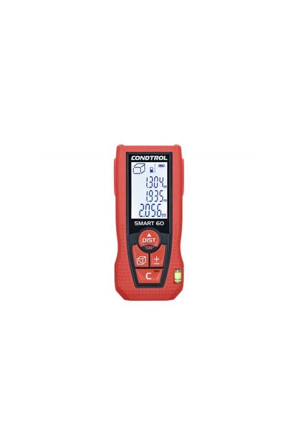 Лазерный дальномер CONDTROL Smart 60 предназначен для измерения длины, расчета площади и объема, вычисления по теореме Пифагора. Он подходит для работы как внутри, так и снаружи помещений на расстоянии до 40 метров. Прибор отличается ударопрочным корпусом, а также простым управлением с помощью всего лишь трех кнопок. Прибор имеет черно-белый дисплей, что позволяет легко считывать данные даже на ярком солнце. Измеряет расстояния до 60 м с точностью до 1,5 мм, оснащён функциями расчёта площади и объёма, памятью на 20 измерений, компактный и надёжный.