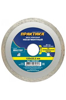 Серия «Мастер». Тип 1A1R. Сегмент 7 мм. ГОСТ 10110-87. Алмазные диски для пиления керамической и мраморной облицовочной плитки. Очень высокая скорость резания. Для ручного электроинструмента и станков. Работа с охлаждением водой. Не для керамогранита. Несегментный алмазный диск 125x22 мм для точной резки керамики и плитки без сколов, совместим с УШМ, отличается надежностью и чистотой работы.
