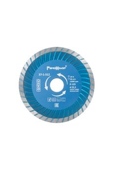Тело диска изготовлено из стали 65n.Синтетическая алмазная крошка по кромке. 30% алмазной крошки в составе связки. Изготовлены по технологии холодного спекания. Применение: Алмазные диски для широкого спектра действия. Применяются для сухого реза кирпича, бетона, натурального и искусственного камня. Способны разрезать тонкую арматуру в бетоне. Высокая скорость резания и продолжительность работы. Турбо-диск 125 мм для быстрой и чистой резки бетона, керамики и кирпича. Универсальность, прочность и точность, для профессионалов и домашних мастеров.
