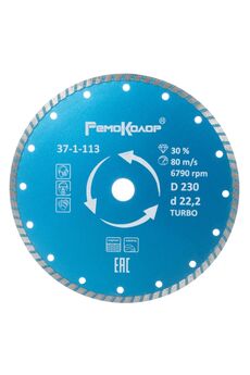 Диск отрезной алмазный универсальный Турбо РемоКолор 37-1-312 применяется для сухого реза кирпича, бетона, натурального и искусственного камня. Способен разрезать тонкую арматуру в бетоне. Высокая скорость резания и продолжительность работы. 30% алмазной крошки в составе связки. Высота сегмента - 7 мм. Охлаждение водой увеличивает ресурс диска. Универсальный диск 125x22,2 мм с турбосегментом для чистого и быстрого реза бетона, кирпича, камня и плитки. Повышенная износостойкость и точность.