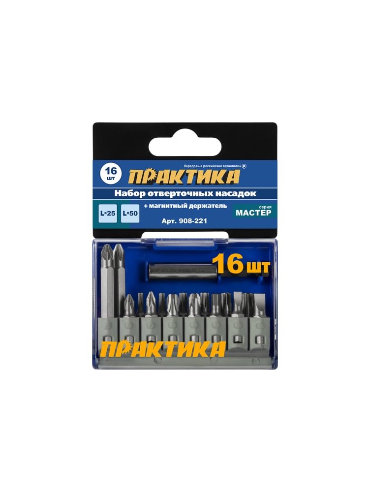 Набор бит ПРАКТИКА "Мастер" PH, PZ, Torx Tamper, HEX, SL - 25 мм, PH, PZ - 50 мм, держатель, 16 шт в Вяземский