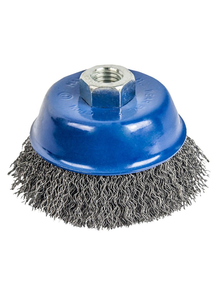 Кордщетки чашеобразные мягкие. Серия "Мастер". Кордщетка для угловых шлифмашин. Резьбовая посадка на шпиндель. Гофрированная стальная проволока. Для обработки дерева, снятия краски, шлифовки металла, снятия ржавчины, обработки сварных швов. Мягкая чашеобразная кордщетка 100 мм для УШМ — отлично очищает металл от ржавчины и краски без повреждений, простая  установка и долговечное использование.