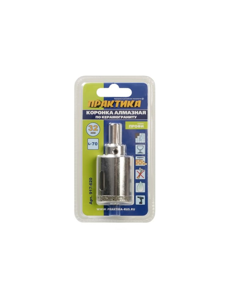 Профессиональное решение для точного и чистого сверления керамогранита, кафеля и керамической плитки даже самой высокой прочности! Используйте алмазную коронку диаметром 32 мм и рабочей длиной 70 мм для создания технологических отверстий под розетки, коммуникации и сантехнические элементы в ванной, кухне, санузле и других помещениях. Оснащена пилотным сверлом для удобного позиционирования и исключения скольжения по гладкой поверхности.