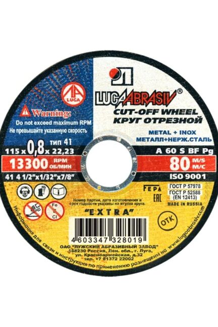 Круг отрезной по металлу и нерж. ЛУГА Extra 115*0,8*22мм в Вяземский