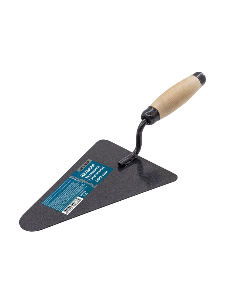 Окрашенная сталь, деревянная усиленная рукоятка с лаковым покрытием для защиты от рассыхания, металлический затыльник. Применение: для кладки в труднодоступных местах и для перемешивания цементного раствора. Кельма бетонщика с усиленной ручкой 200×150 мм для точной укладки и моделирования раствора, устойчива к деформациям, удобна и долговечна.