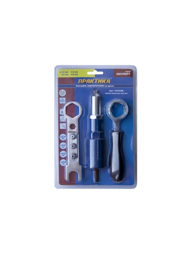Заклепочник ПРАКТИКА насадка для шуруповерта для заклепок 2,4-4,8 мм метал. корпус, с бок.рукояткой в Вяземский