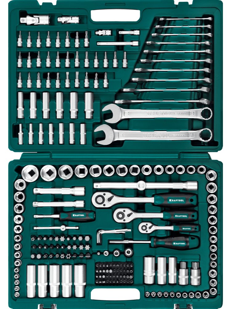 - 216 предметов: широкая гамма торцевых и свечных головок, трещоток, удлинителей, бит, ключей и аксессуаров