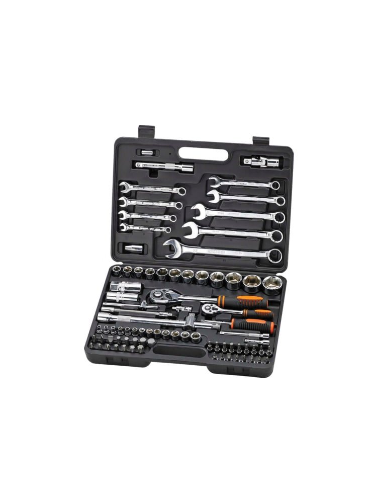 - 82 предмета в комплекте: трещотки 1/2" и 1/4", головки, удлинители, битодержатель, разнообразные насадки и аксессуары.