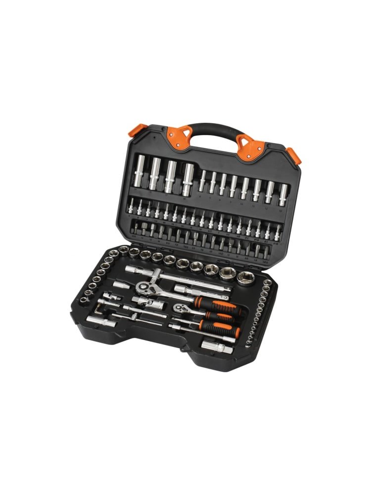 • 94 предмета: воротки, трещотки, удлинители, кардан, головки 1/2" и 1/4", битовые насадки, свечные ключи и аксессуары.