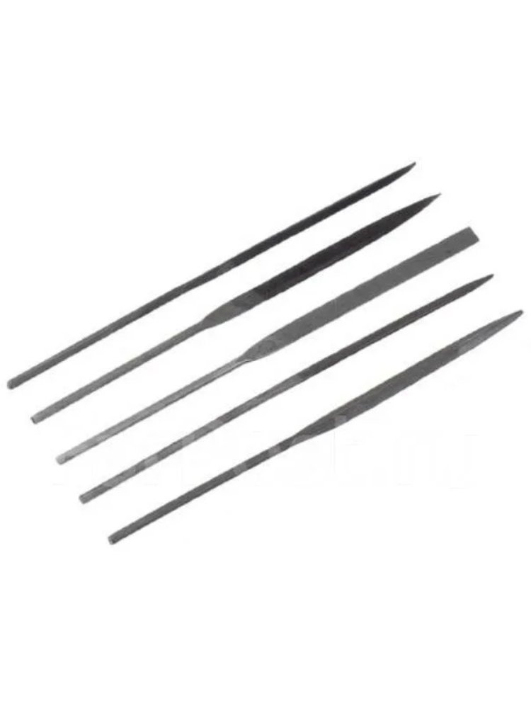 - В комплекте 5 надфилей разной формы для точных работ: плоский, круглый, квадратный, треугольный, полукруглый