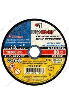 Круг отрезной по металлу Луга оптимально подойдет для резки металлоконструкций а так же тонкого листового металла. Тонкий и прочный круг для точной и быстрой резки металла и нержавейки, подходит для УШМ 150 мм, гарантирует чистый рез без заусенцев.