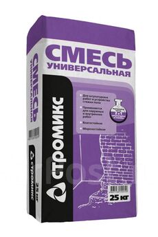 Универсальная смесь для кладки и штукатурки, быстро схватывается, подходит для внутренних и наружных работ, держит прочность и влагостойкость.