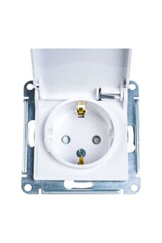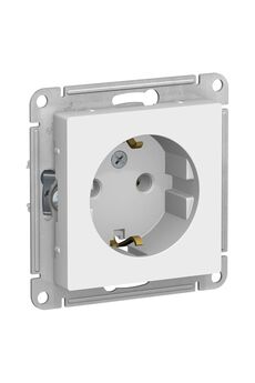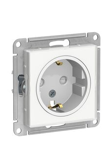 Белая розетка с заземлением на 16А, скрытый монтаж, прочный механизм, надежная электробезопасность и универсальный дизайн для любых помещений.
