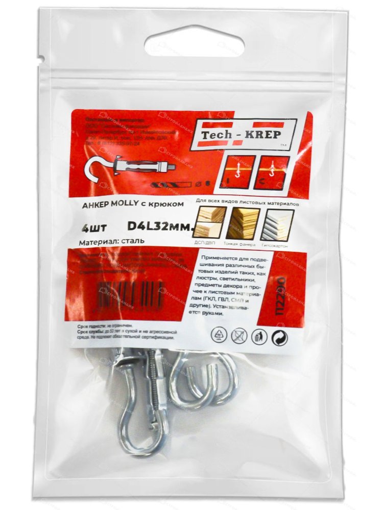 Анкер (дюбель) Молли RO (с полукольцом) М4х32 (4 шт) - пакет Tech-Krep в Вяземский