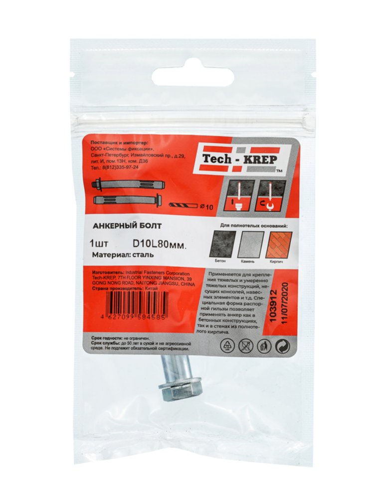 Анкерный болт 10х80 мм от Tech-Krep – это надежный крепежный элемент, выполненный из углеродистой стали с антикоррозийным цинковым покрытием, что обеспечивает долговечность и устойчивость к внешним воздействиям. Диаметр болта составляет 10 мм, длина – 80 мм, что позволяет использовать его для крепления конструкций средней тяжести. Конструкция включает распорный механизм, который гарантирует прочное и устойчивое соединение в бетоне и других твердых материалах. Упаковка содержит 1 штуку, что удобно для точечных работ. Простота установки делает этот крепеж популярным как среди профессионалов, так и среди домашних мастеров.