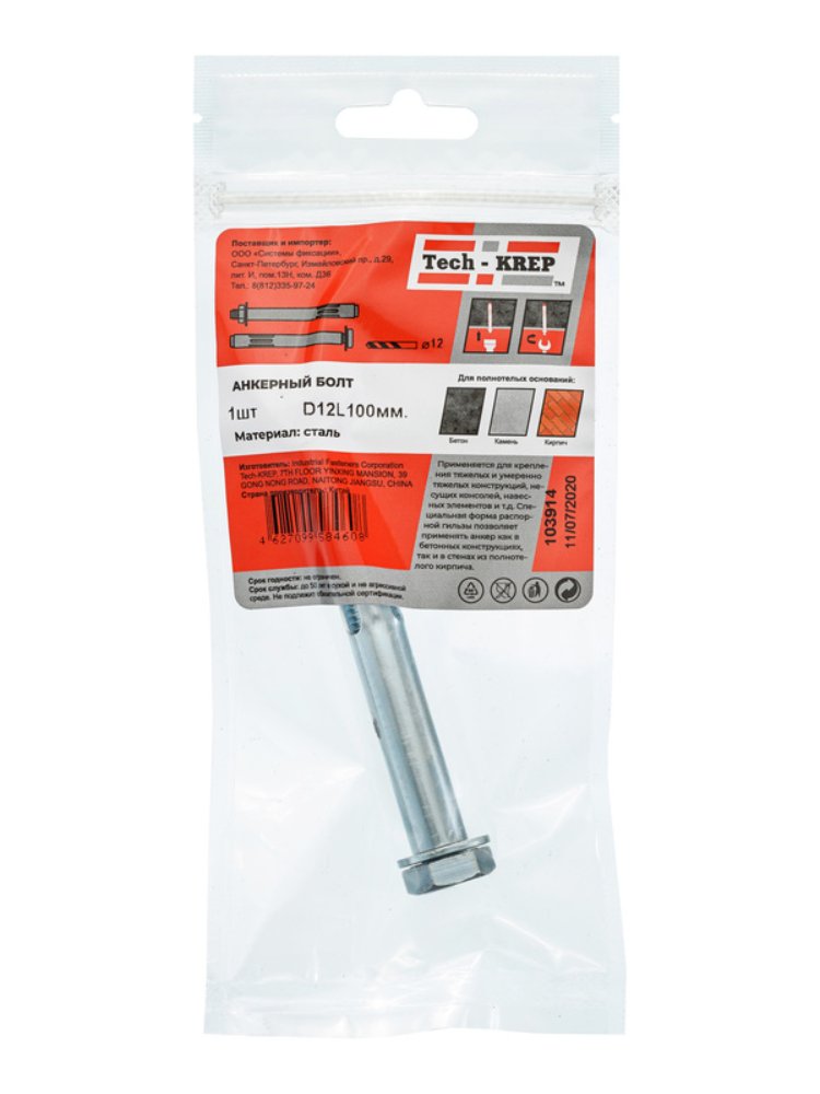 Анкерный болт 12х100 мм от Tech-Krep представляет собой надежный крепежный элемент, предназначенный для создания прочных соединений в строительных конструкциях. Изготовлен из высококачественной стали с антикоррозийным покрытием, что гарантирует долговечность даже в условиях повышенной влажности. Диаметр 12 мм и длина 100 мм обеспечивают универсальность применения в различных материалах, включая бетон, кирпич и камень. Конструкция болта с распорной гильзой обеспечивает максимальную фиксацию за счет расширения в основании материала при затягивании гайки. Комплектация включает 1 шт, упакованную в удобный пакет.