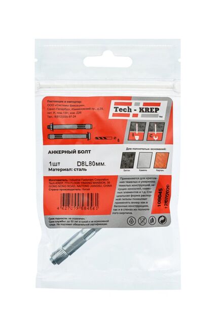 Анкерный болт 8х80 мм Tech-Krep для надежного крепления к бетону и кирпичу. Прочная сталь, антикоррозийное покрытие, простота установки, 1 шт. в упаковке.
