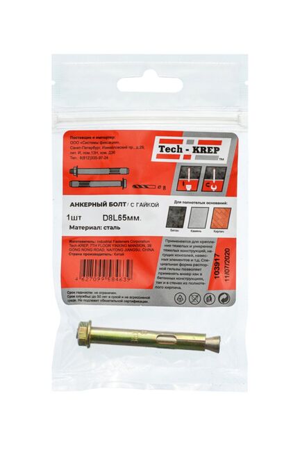 Анкерный болт с гайкой 8х65 Tech-Krep - надежный крепеж для бетона и кирпича. Стальная конструкция, защита от коррозии, легкий монтаж.