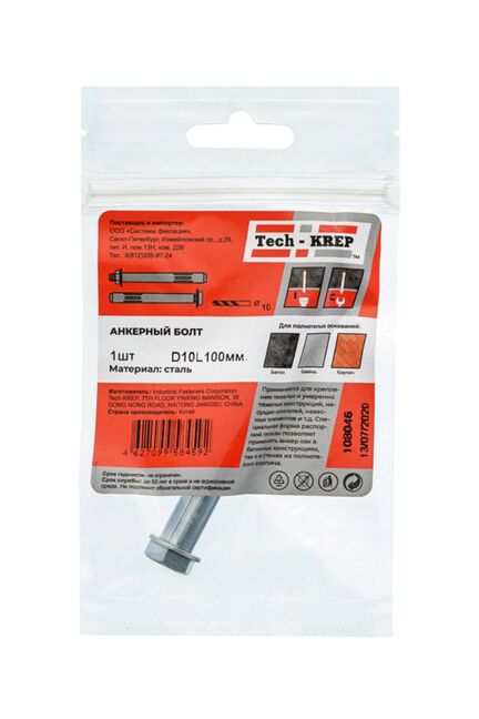 Анкерный болт 10х100 мм от Tech-Krep представляет собой надежное крепежное изделие, предназначенное для создания прочных соединений в строительных конструкциях. Изготовлен из высококачественной стали с антикоррозийным покрытием, что обеспечивает долговечность и устойчивость к внешним воздействиям. Диаметр 10 мм и длина 100 мм позволяют использовать его для крепления тяжелых элементов к бетонным, кирпичным или каменным основаниям. Конструкция болта с распорным механизмом гарантирует надежную фиксацию даже в условиях высоких нагрузок. Поставляется в удобной упаковке по 1 штуке, что подходит для небольших ремонтных или строительных задач.