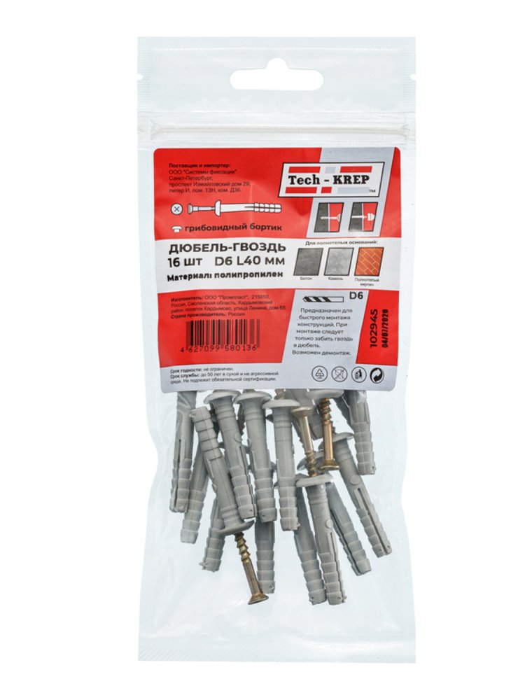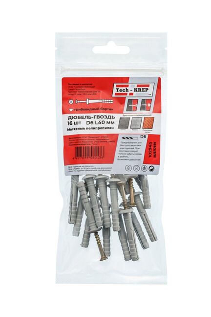 Дюбель-гвоздь 6х40 мм с грибовидной манжетой, черный полипропилен, 16 шт. в упаковке Tech-Krep. Надежное крепление к бетону и кирпичу.