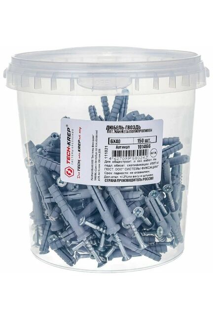 Дюбель-гвоздь 6х40 с потайной манжетой из полипропилена черного цвета от Tech-Krep предназначен для надежного крепления различных конструкций к бетонным, кирпичным и другим твердым основаниям. Диаметр 6 мм и длина 40 мм обеспечивают оптимальную фиксацию. Потайная манжета скрывает крепеж, делая соединение эстетичным, а материал дюбеля устойчив к коррозии и механическим нагрузкам. Комплект поставляется в удобном ведре, содержащем 150 штук, что идеально для крупных строительных и монтажных работ.