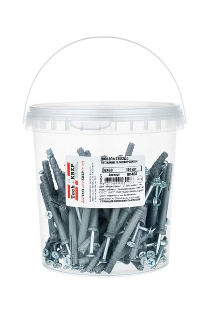 Дюбель-гвоздь 6х60 с потайной манжетой из полипропилена черного цвета от Tech-Krep предназначен для надежного крепления различных конструкций к бетонным, кирпичным и другим твердым основаниям. Упаковка в виде ведра содержит 100 штук, что удобно для больших объемов работ. Дюбель изготовлен из качественного полипропилена, а гвоздь — из прочной стали с антикоррозийным покрытием, что обеспечивает долговечность крепления. Потайная манжета позволяет скрыть крепеж, обеспечивая эстетичный вид поверхности. Подходит для монтажных работ в условиях повышенной влажности благодаря устойчивости материалов к коррозии.