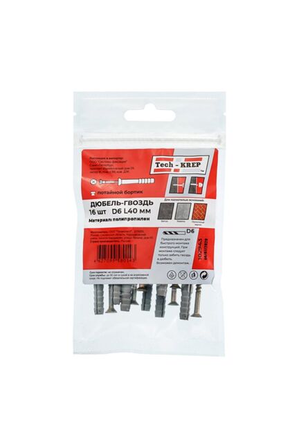 Дюбель-гвоздь 6х40 с потайной манжетой из полипропилена черного цвета от Tech-Krep поставляется в упаковке по 16 штук. Этот крепежный элемент предназначен для надежного монтажа различных конструкций к бетонным, кирпичным или каменным основаниям. Дюбель изготовлен из прочного полипропилена, а гвоздь имеет оцинкованное покрытие, что обеспечивает защиту от коррозии и долговечность крепления. Потайная манжета позволяет скрыть крепеж, обеспечивая эстетичный вид поверхности после установки. Подходит для быстрого и простого монтажа с использованием молотка.