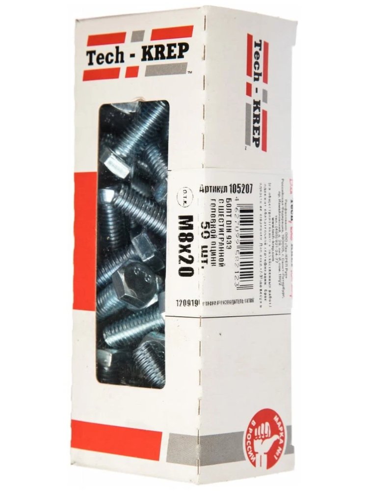 Болт DIN933 с шестигранной головкой, оцинк., М8х20, 50 шт. в коробке с окном от Tech-Krep. Прочный, антикоррозийный, для строительства и ремонта.